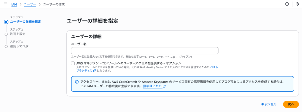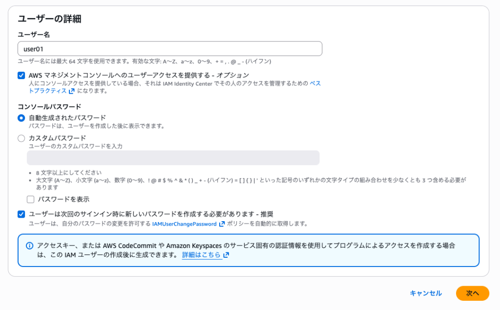 「AWSマネジメントコンソールへのユーザアクセスを提供する」にチェックを入れると