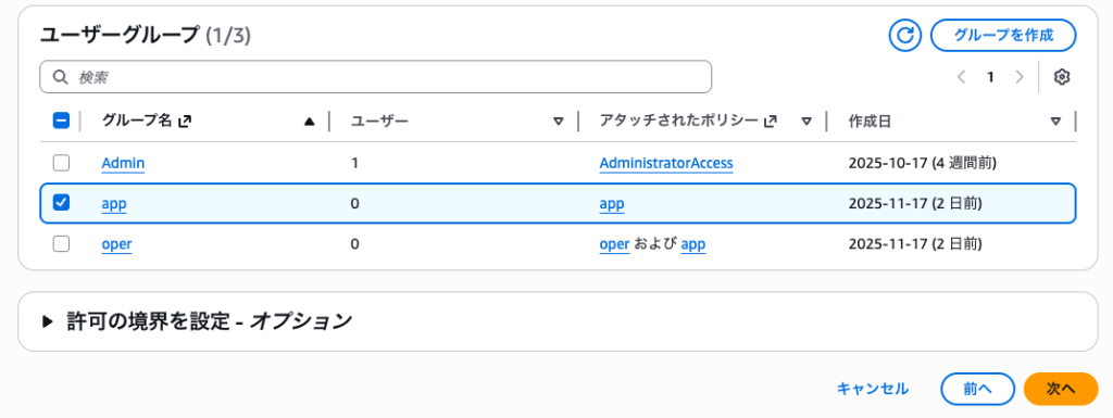 今回のユーザは「app」グループを選択して「次へ」を押下