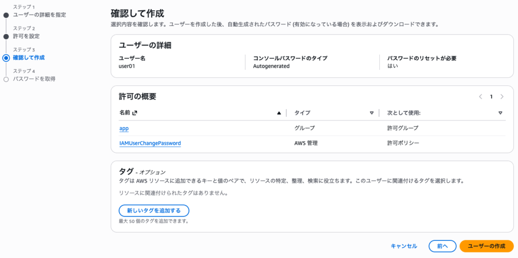 前回ポリシー付与したグループに入れるユーザを作成するよ