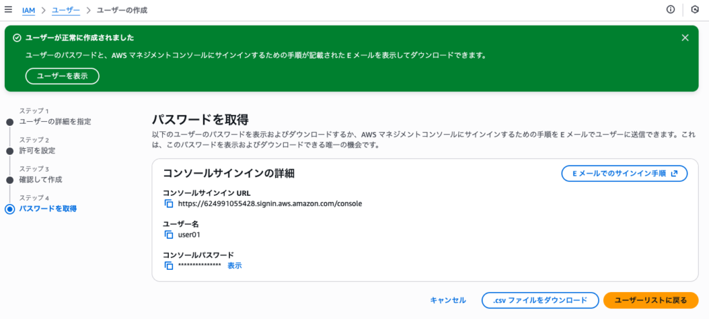 ユーザ名とコンソールのパスワードは作成したユーザでログインするために必要な情報なので