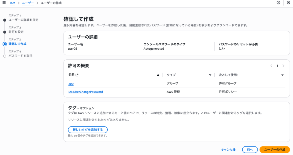 今回はグループに追加するためのユーザを作成しているため、このままにして