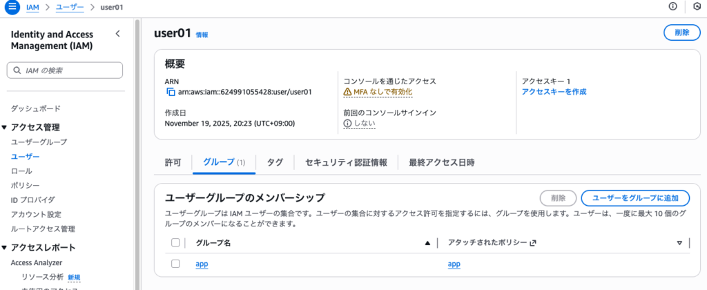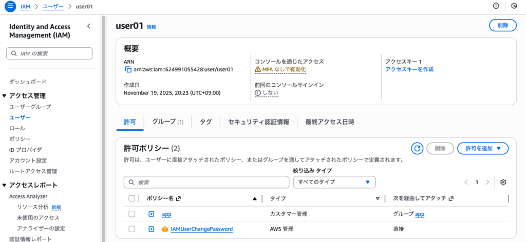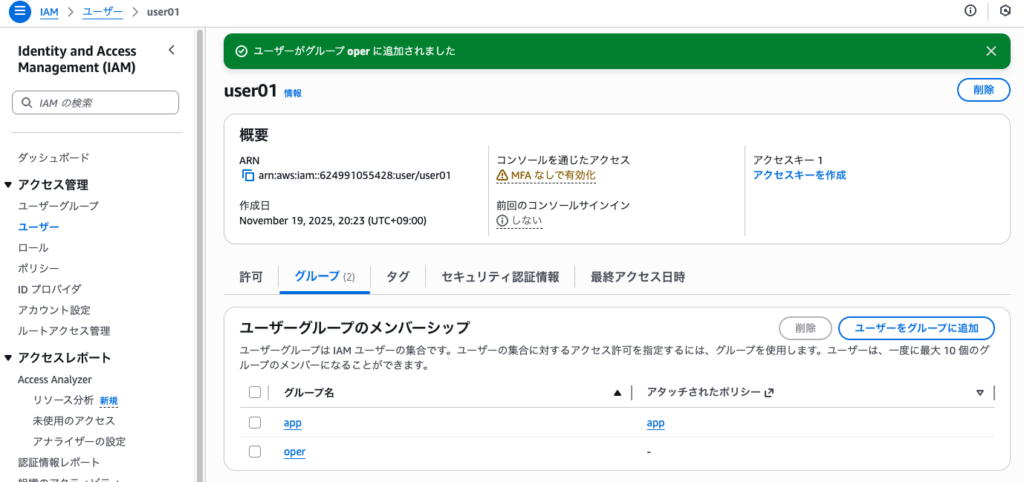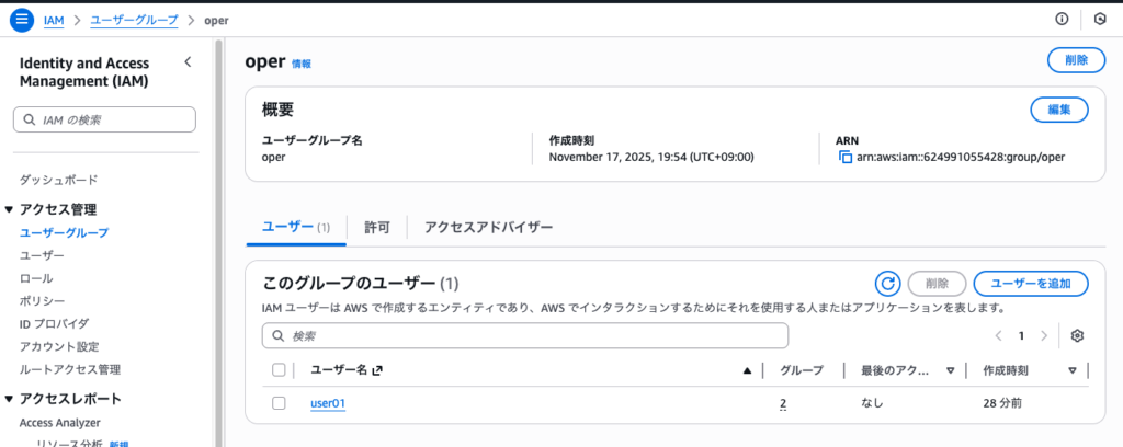 また、グループに付与しているポリシーがそのまま所属ユーザに適用できることも学んだ