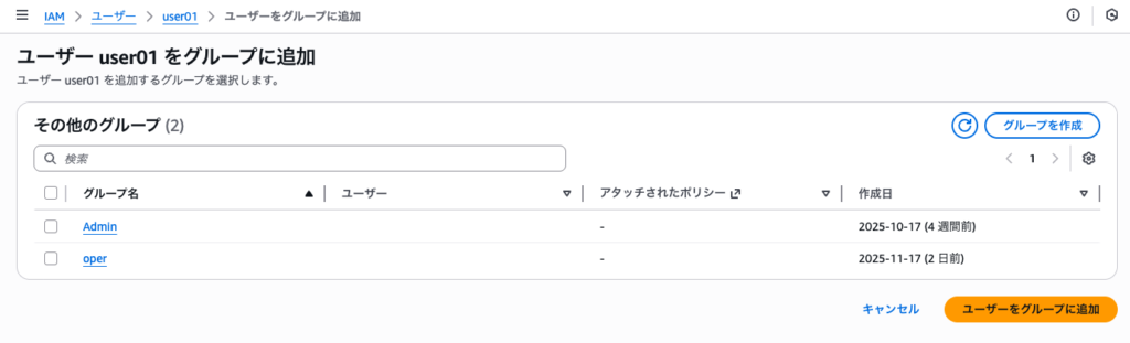 前回は、グループ作成して、それにポリシーを付与したので
