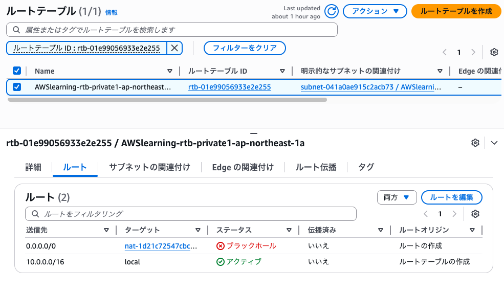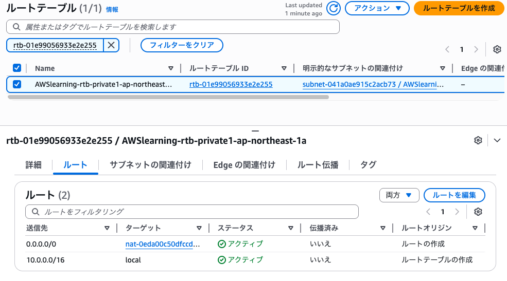 選択したルートテーブルの「ルート」タブを確認する